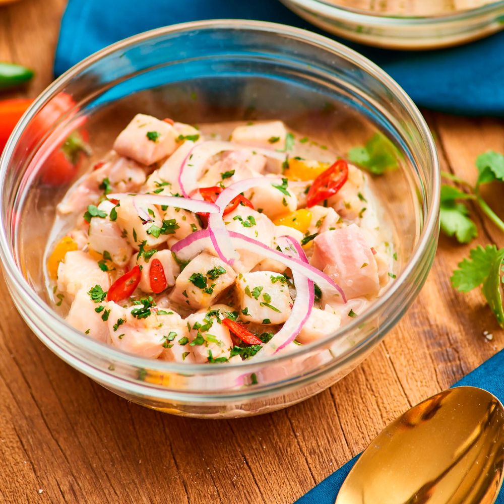 Cubes of fish marinated in lime juice with tomato, onion, mango, and carrot.