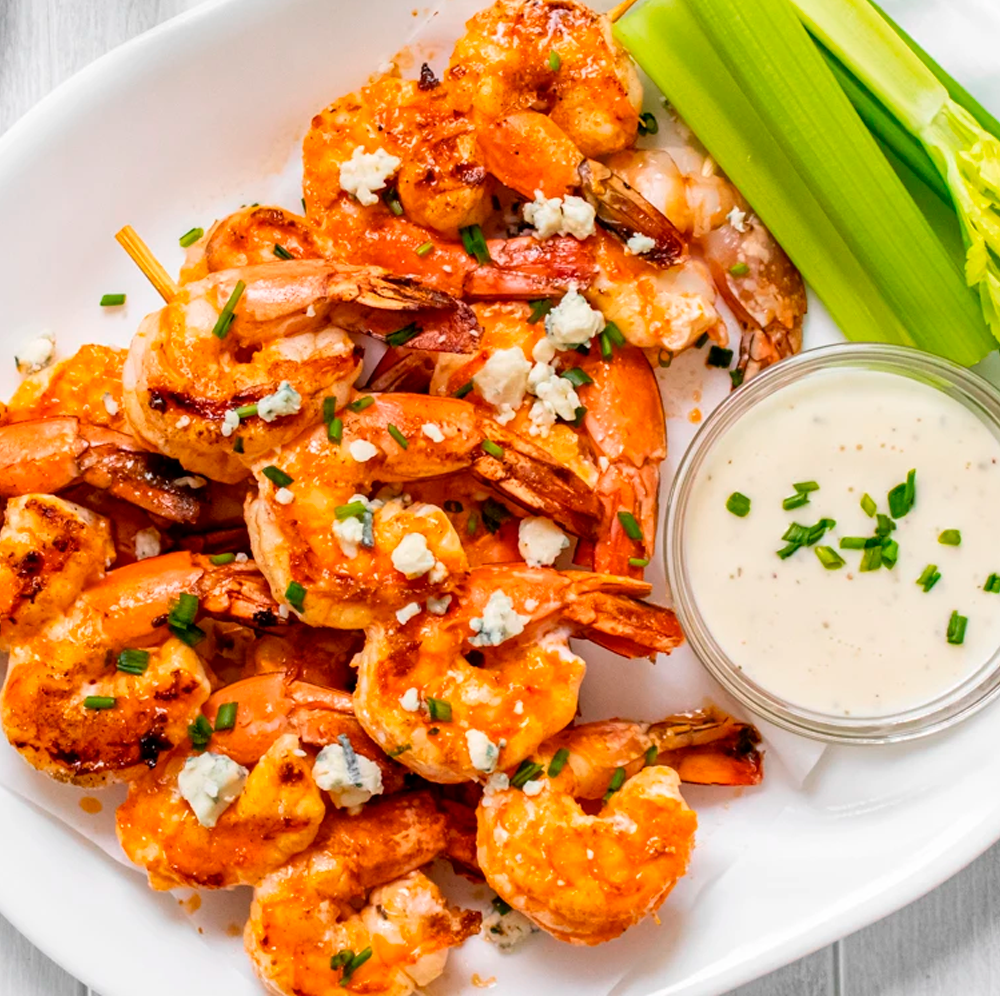 Grilled shrimp served with sour cream and teriyaki sauces.
