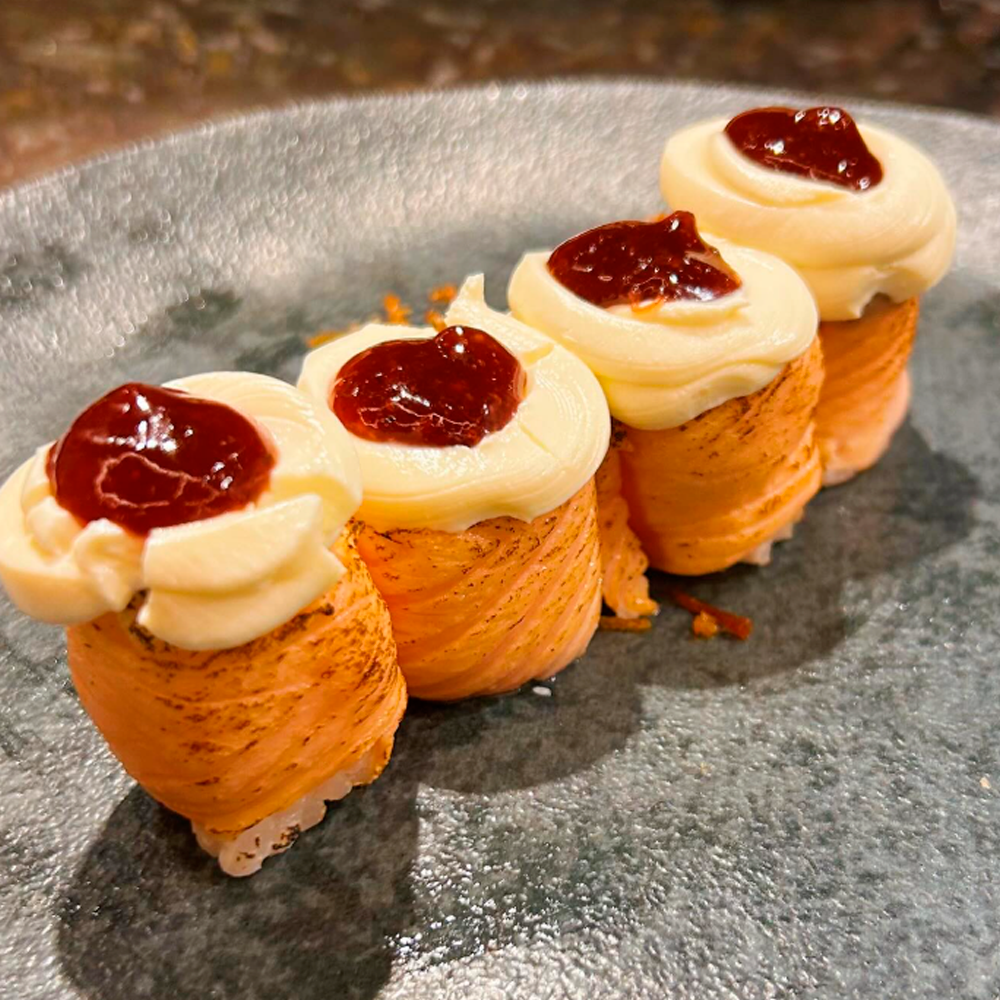Salmon, rice, and cream cheese, with scallions, leek, and strawberry jam.