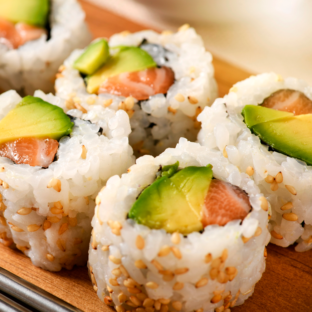 Rice, salmon, avocado, and cream cheese.